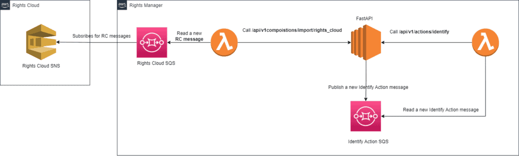 Every day, the Rights Manager system ingests Rights Cloud messages, which detail changes regarding a specific client’s composition metadata and ownership shares. For this, we had implemented the Fan-Out Pattern, so Rights Cloud sends the message to a dedicated topic (SNS) and then Rights Manager copies the message to its own queue (SQS). For every message that Rights Manager ingests successfully two things happen: