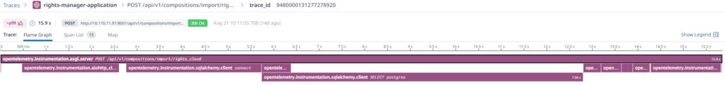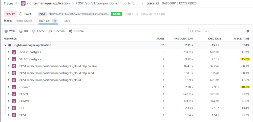 We examined another slow request (15.9 seconds) and the results were completely different. This time, we discovered a slow response from the database. The API call needed ~3 seconds to connect to the database and a SELECT statement on the Compositions table needed ~4 seconds. This troubled us because the SELECT query uses indexes and cannot be further optimized. Additionally, 3 seconds to obtain a database connection is really a lot.