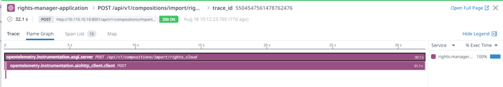 First, we examined the slowest request (32.1 seconds). We discovered that sending a message to an SQS took 31.7 seconds, a duration far too long for our liking. For context, the SQS is managed by AWS and it was hard to believe that a seemingly straightforward service would need 30 seconds to reply under any load.