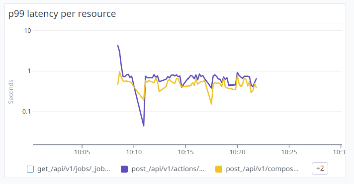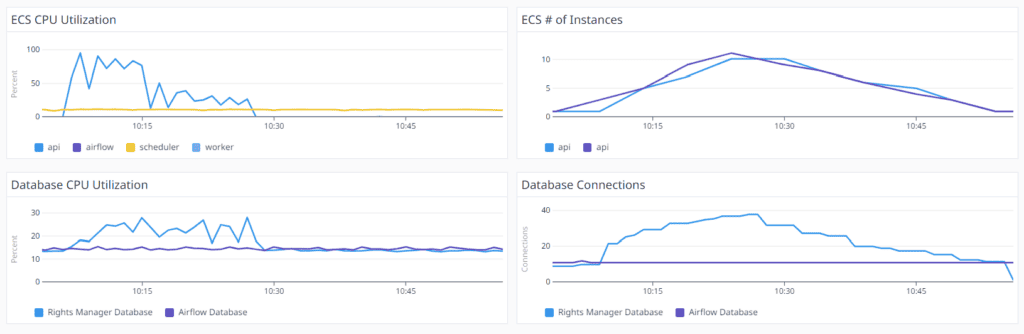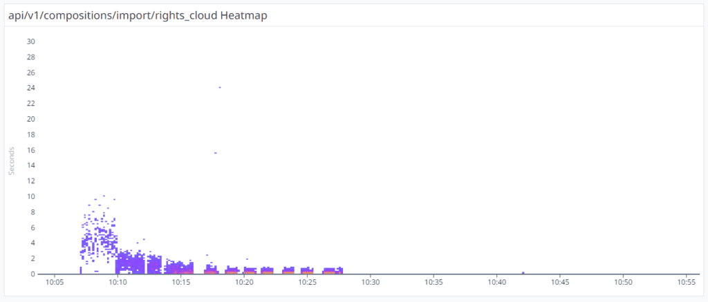 We backed up our conclusion by creating a new Datadog Heatmap. The below diagram explains the aggregation of the duration of each Import Rights Cloud Composition. It is clear, that when the 2 new FastAPI instances were spawned at 10:10 am, the delays were decreased from 10 seconds to 3 seconds. At 10:15 am there were 5 FastAPI instances and the responses dropped to 2 seconds. Around 10:30 the system spawned 10 instances and all the responses duration was around 500ms.